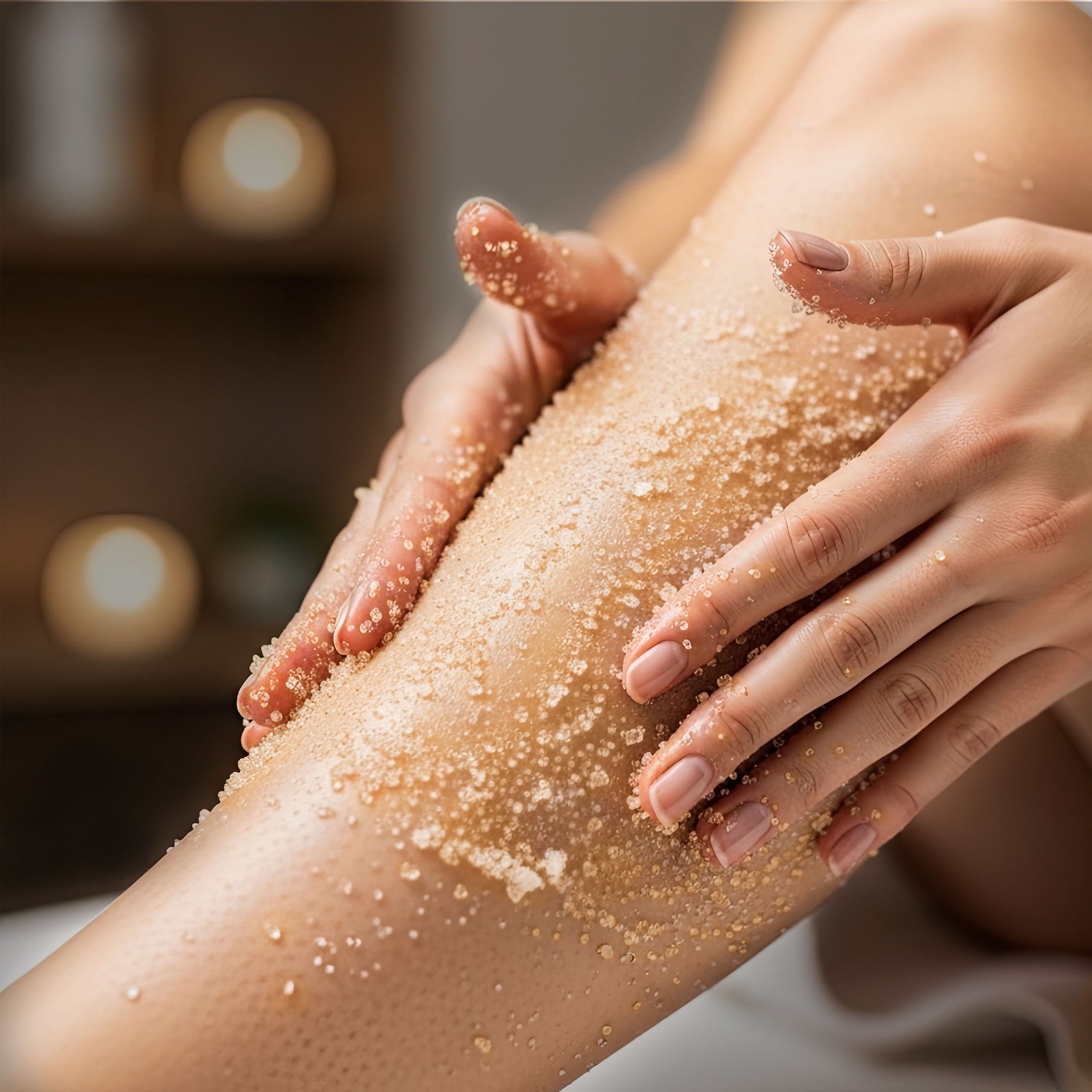 - دلك بشرتك بلطف بحركات دائرية، مع التركيز على المناطق الجافة مثل الكوعين والركبتين.